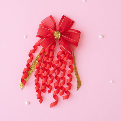 A pinwheel bow on alligator pins with danglers - Red, Gold