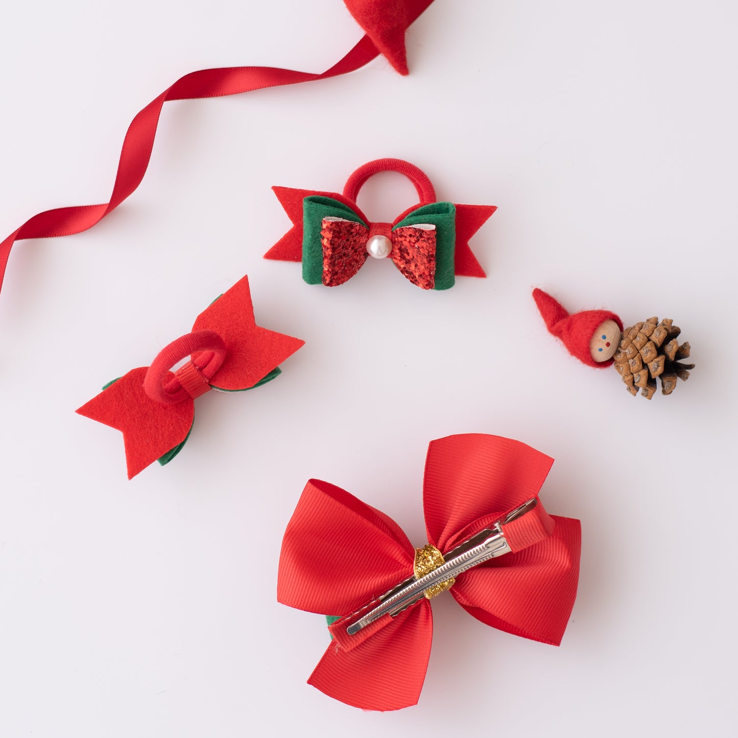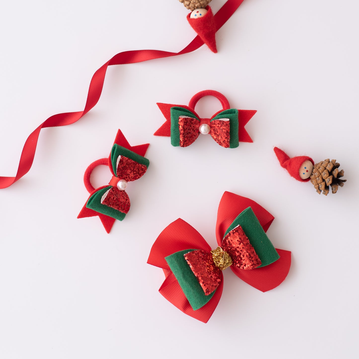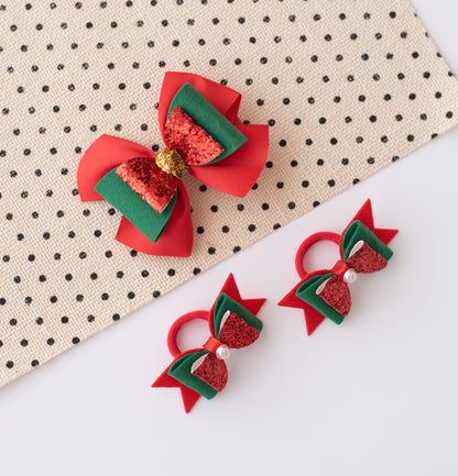 Combo : Set of 1 pair glitter rubberbands and 1 gliter bow on alligator clip. - Red, Green