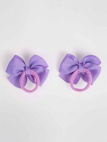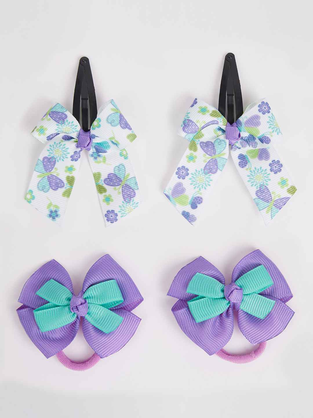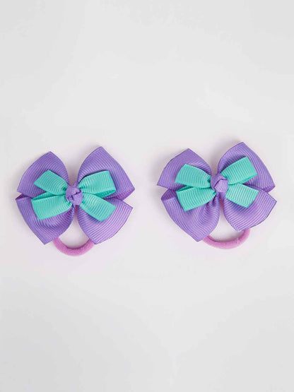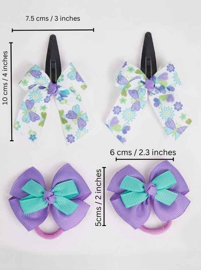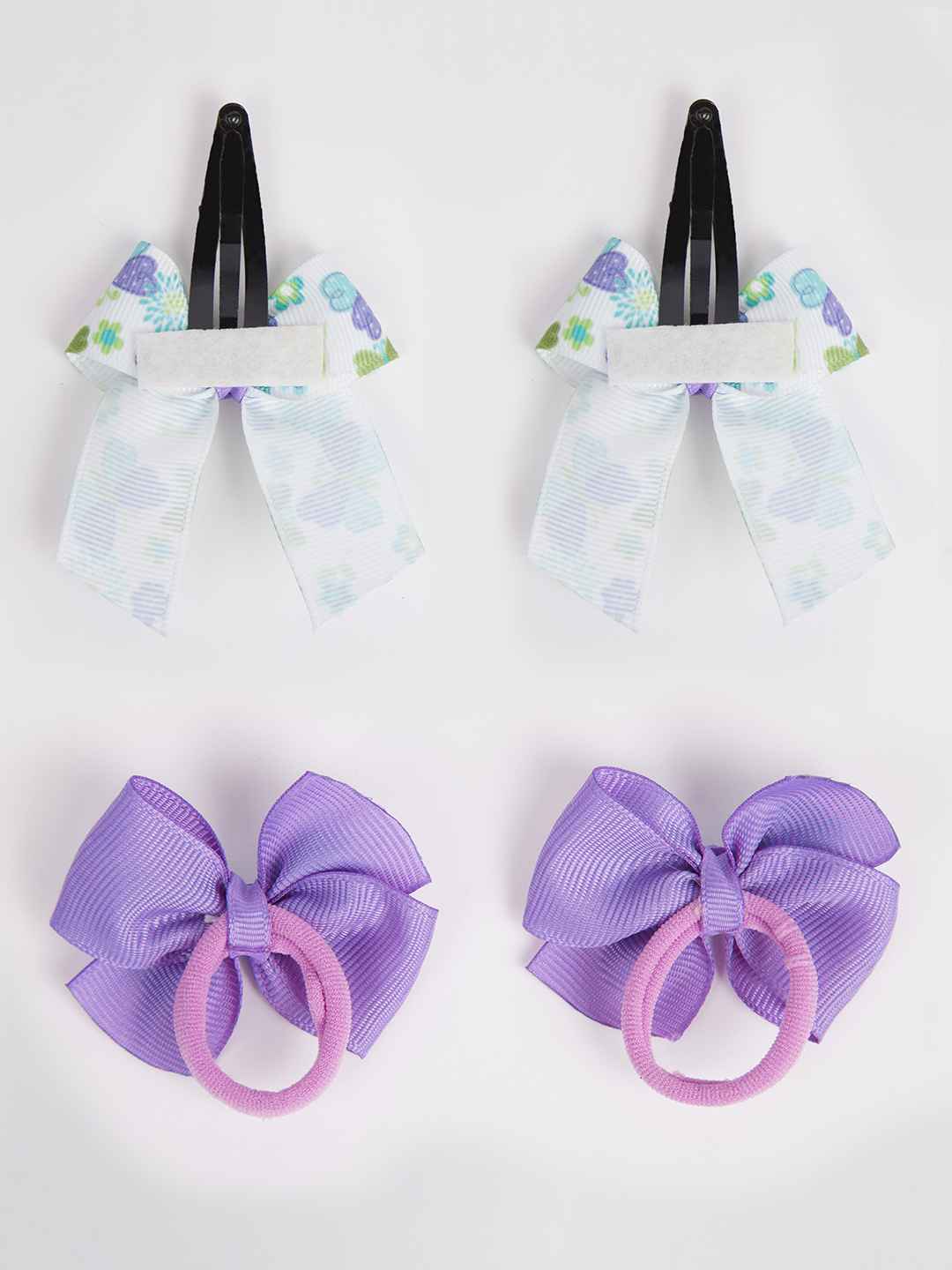Combo:1 Pair printed bow tic-tac pins and 1 pair dual bow rubber bands-Purple, White