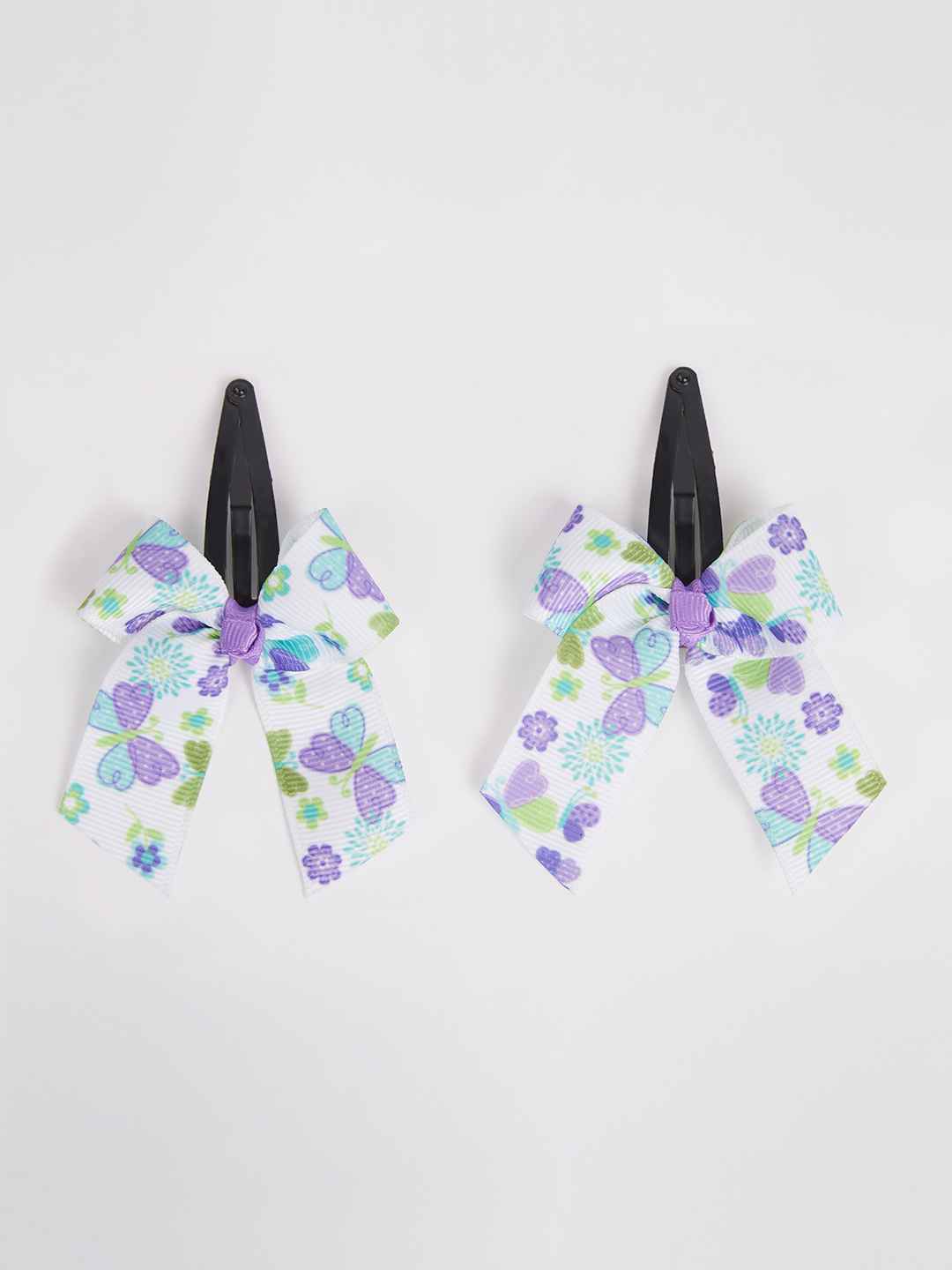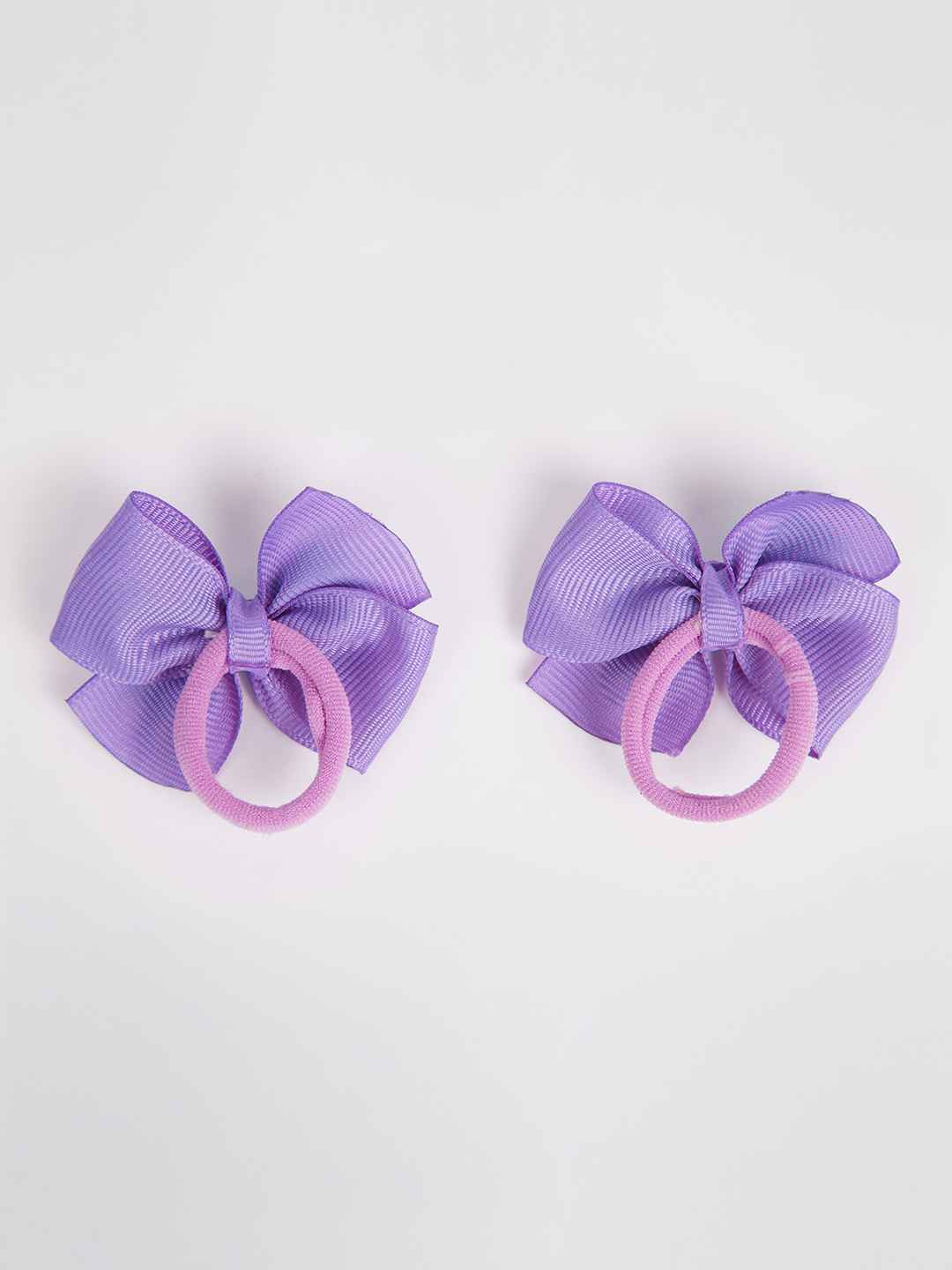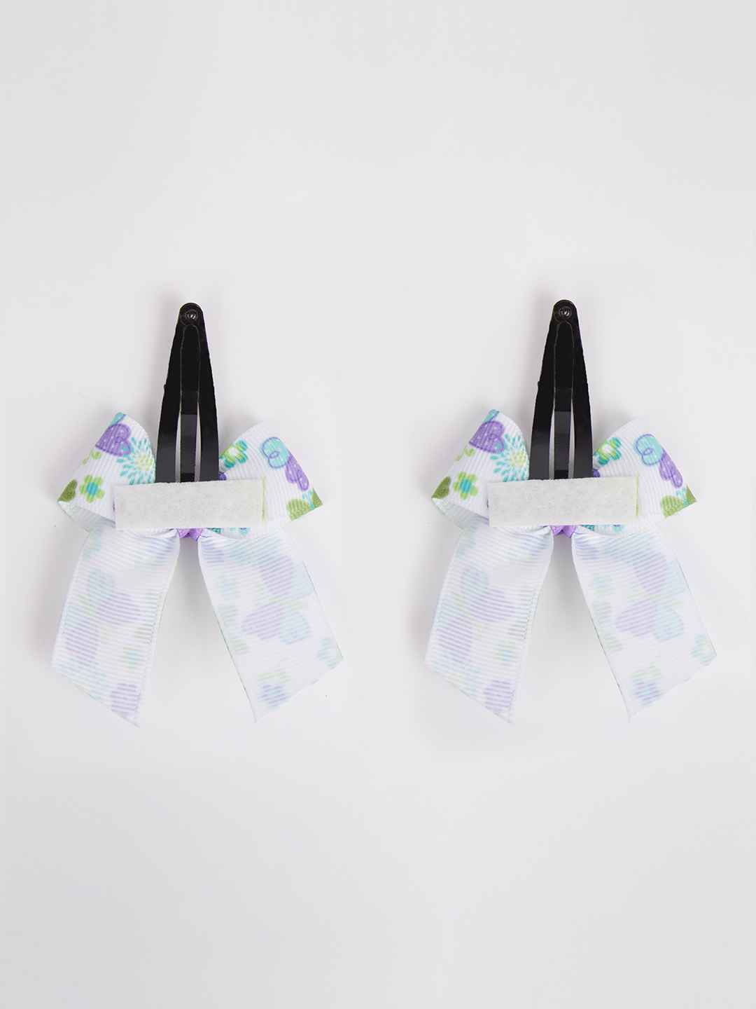 Combo:1 Pair printed bow tic-tac pins and 1 pair dual bow rubber bands-Purple, White