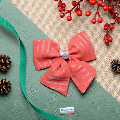 Red Cute Silver Striped Fabric Bow on Alligator Clip