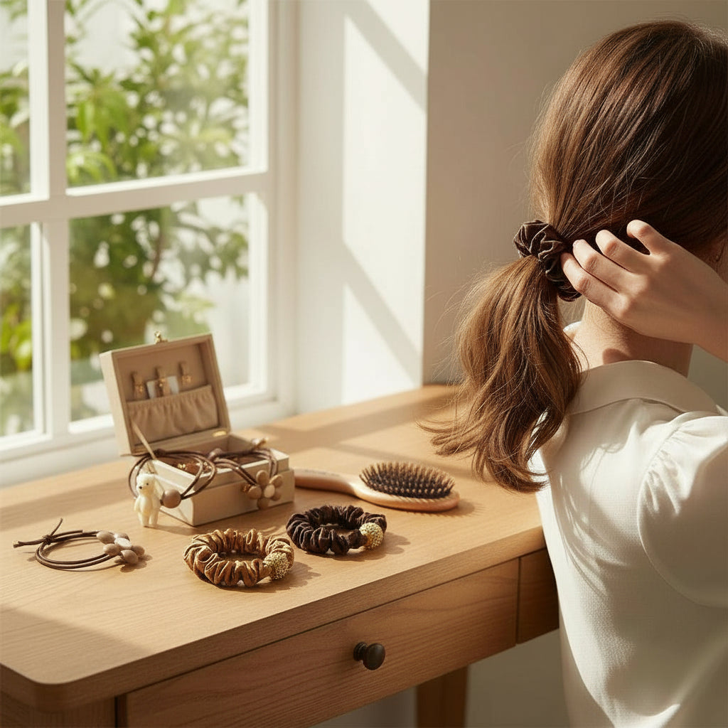 Set of 5 Stylish Scrunchies in shades of brown. Gentle on hair and suitable for daily wear.
