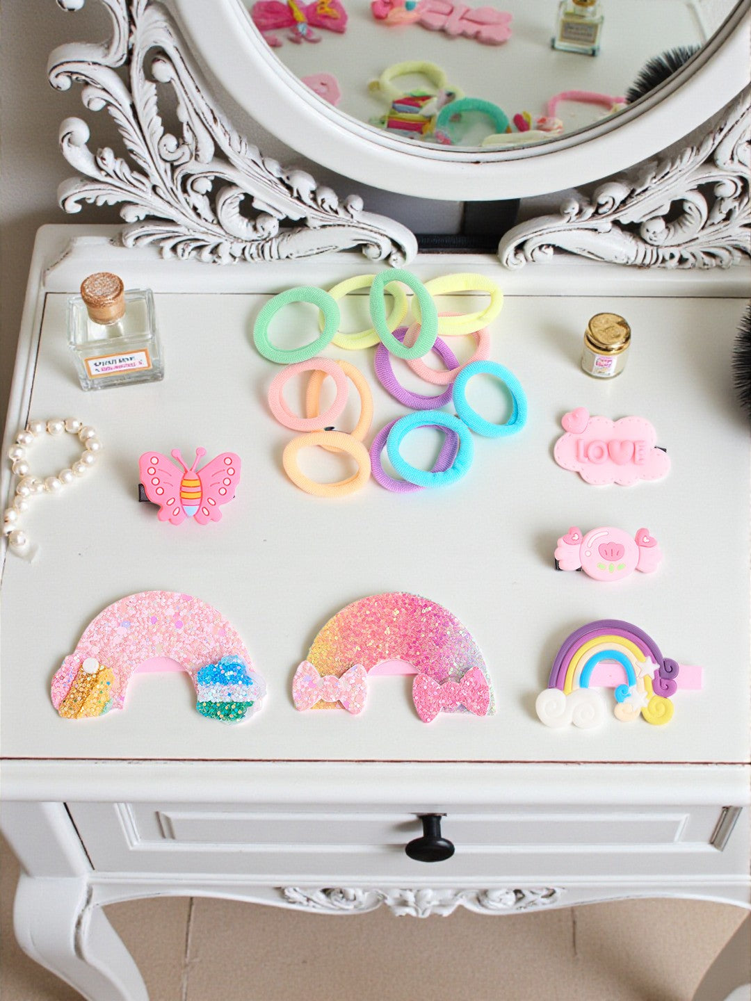 Cute assorted rubber bands paired with glitter alligator clips for fun hairstyles.