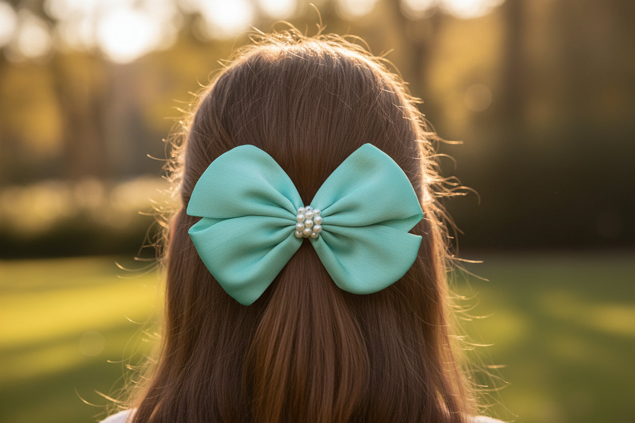 This elegant satin pinwheel bow, adorned with pearls adds a touch of sophistication to any outfit. Suitable for both kids and adults.