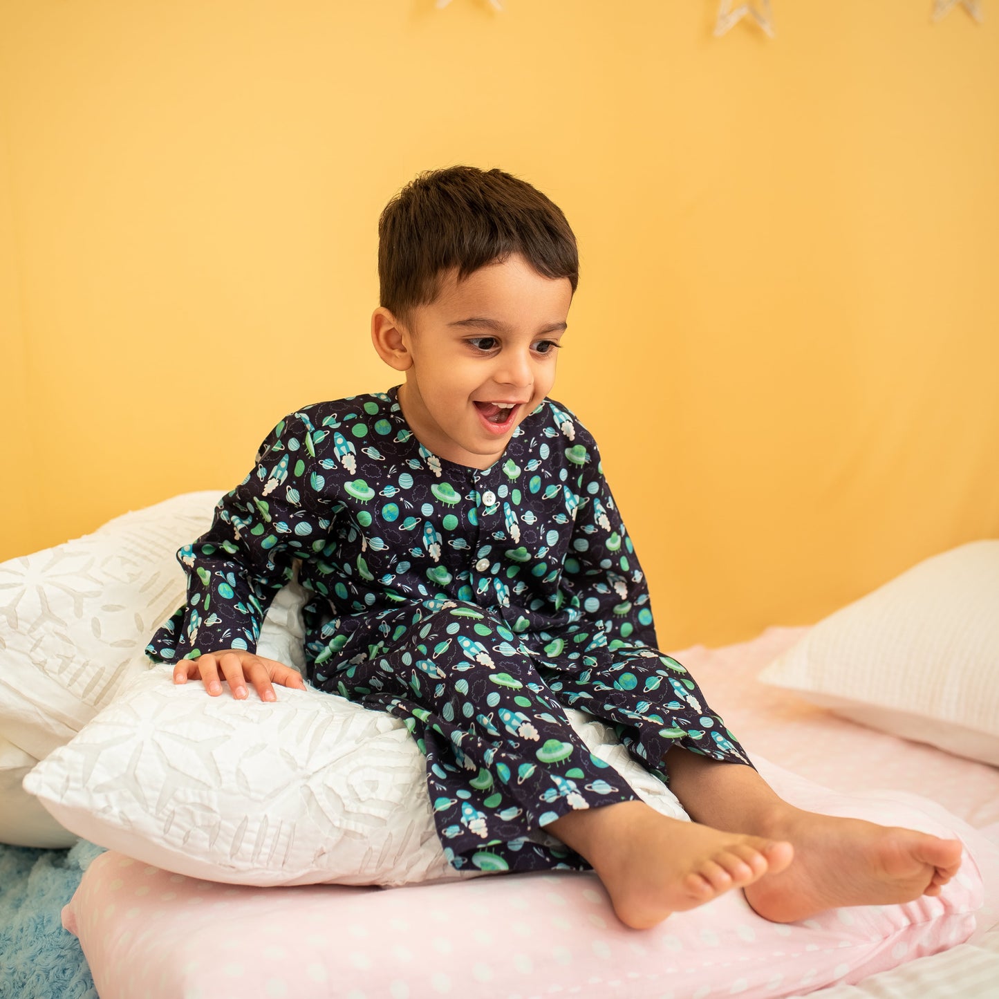 Searching for a planet filled with only fun and happiness is far from reality, but with our quirky prints we try to bring alive all their fantasies. And we make sure that they are comfy on their quest with our soft, 100% pure cotton material, handmade with love.