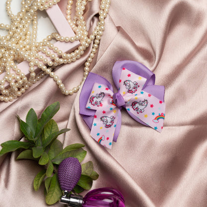 Dual Bow With Unicorn Print on Alligator Clip - Purple & White