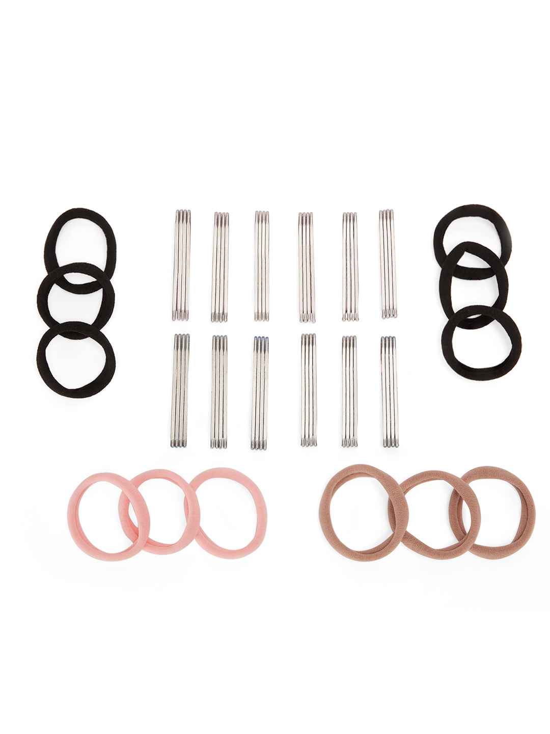 Add a touch of sparkle to your hairstyle with this chic set of solid and glitter bobby pins. Comes with coordinating rubber bands in elegant pink and black shades.