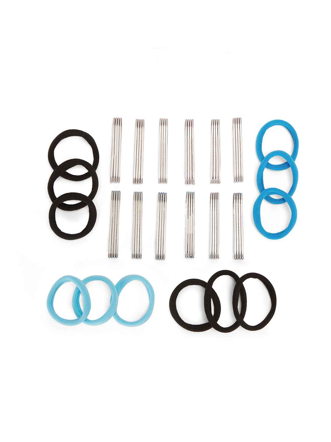 Add a touch of sparkle to your hairstyle with this chic set of solid and glitter bobby pins. Comes with coordinating rubber bands in elegant blue, purple, and black shades.